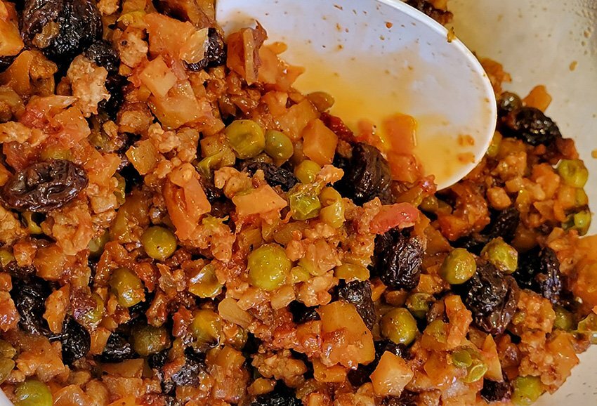- Throw the rest of ingredients starting with potatoes, carrots, peas and raisins within 5 minute intervals. Don’t forget to sprinkle with salt and pepper to season. Set it aside to cool off when cooked. Proceed to the dough making process.
