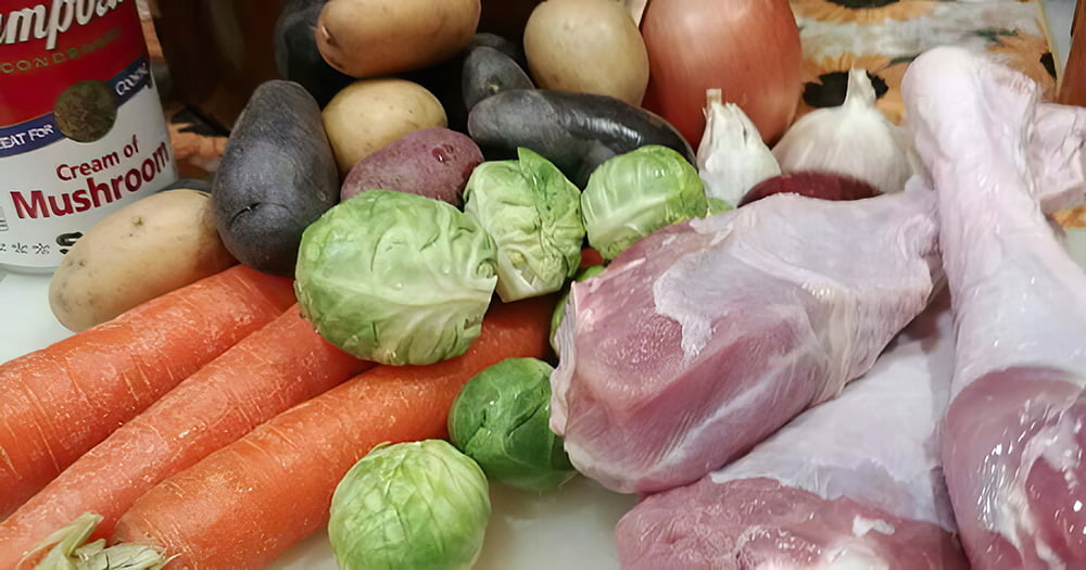 - Wash and chop all ingredients, throw the turkey or chicken first in the slow cooker, then add all the vegetables on top.