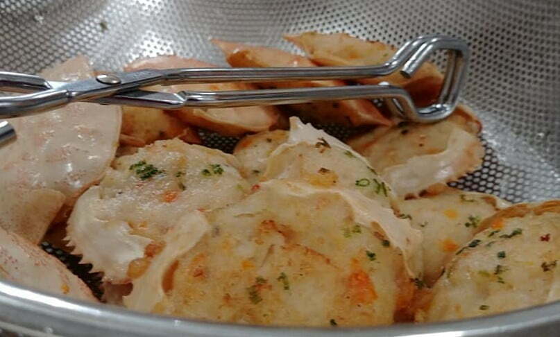 6. Drop each shell with the stuffed fillings facing up to avoid ingredients from spilling off from the shells. Whisk each crab fillings with hot oil while they are frying, until cooked.