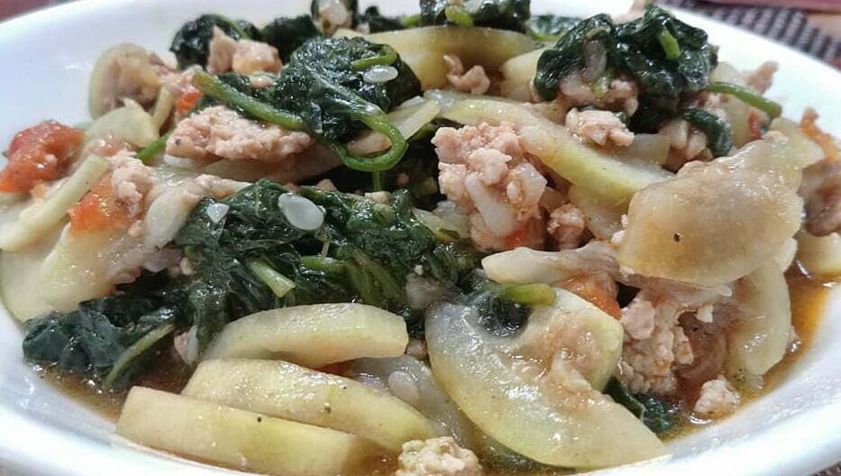 Ginisang Upo sa Giniling na Manok at Dahon ng Spinach(Sauteed Bottle Gourd in Ground Chicken & Spinach Leaves)
