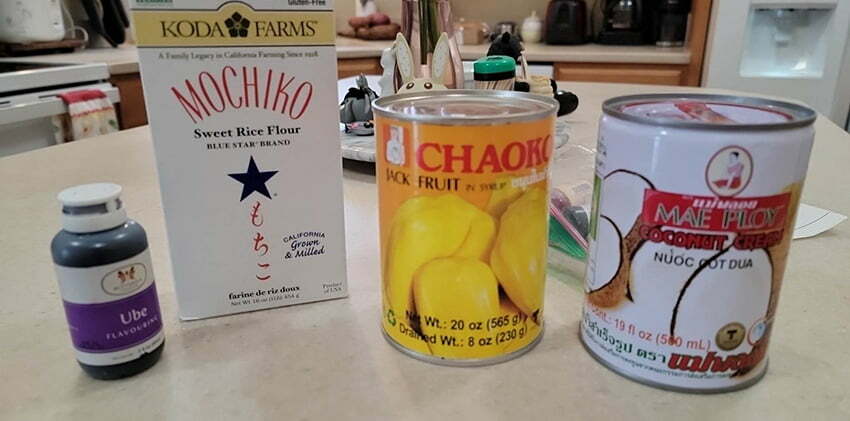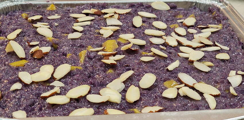 Many biko recipes are topped with latik, a sweet condiment made from coconut milk curds, while others use condensed milk curds. Millie has a unique twist on the classic recipe by adding Ube (purple yam) flavoring and sliced ripe jackfruit to the sweet rice cake mixture. She also tops it off with a sprinkle of thinly sliced, roasted almonds. You absolutely must try it – it’s a truly delicious treat!