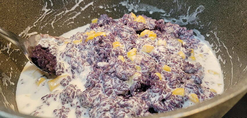 4. Apply sugar, ube flavoring, vanilla extract, followed by the sliced jackfruit. Continue to stir until all ingredients are fully incorporated. The Ube flavored Biko or Linungkay should have been fully incorporated at this time and texture is fluffy-thick.